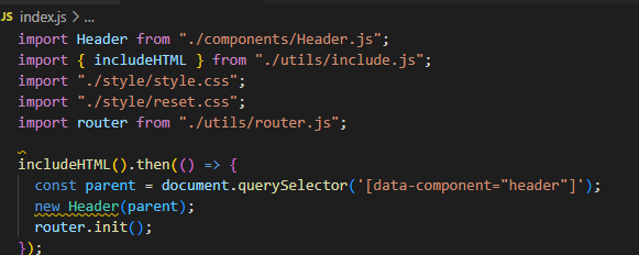 그리고 해당 함수가 비동기로 데이터를 불러오기 때문에 프로젝트에서 사용하는 모든 자바스크립트 내용은 해당 데이터가 모든 html파일을 로딩한 뒤에 사용하게 해야 자바스크립트 코드에서 문제가 발생하지 않았습니다. 따라서 index.js에서는 includeHTML 함수를 아래와 같이 사용하였습니다.