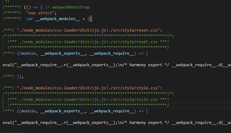 import한 css 파일은 bundle.js 결과물을 열어보면 css 파일이 들어가 있는 것을 확인할 수 있습니다.